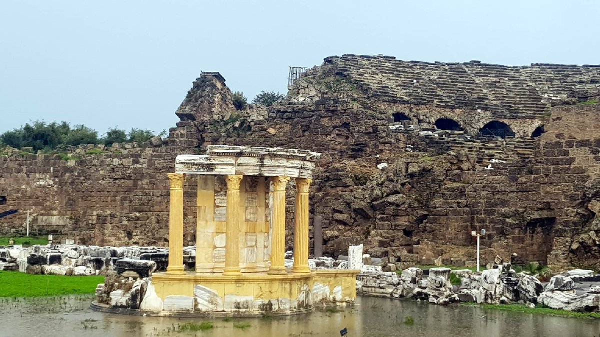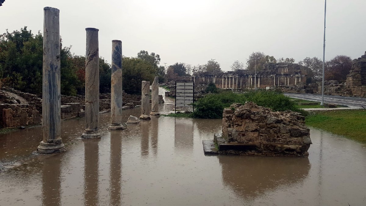 Diğer yandan şiddetli yağış nedeniyle Side Antik Kenti'de Sütunlu Cadde ve Tyke Tapınağı'nın bulunduğu alan su altında kaldı. Dün yapılan şiddetli yağış ve fırtına uyarısının ardından Side Limanı'nda bulunan tekne ve motorlar sahipleri tarafından güvenli yerlere çekildi. Yağış nedeniyle Apollon Tapınağı da boş kaldı. (DHA)