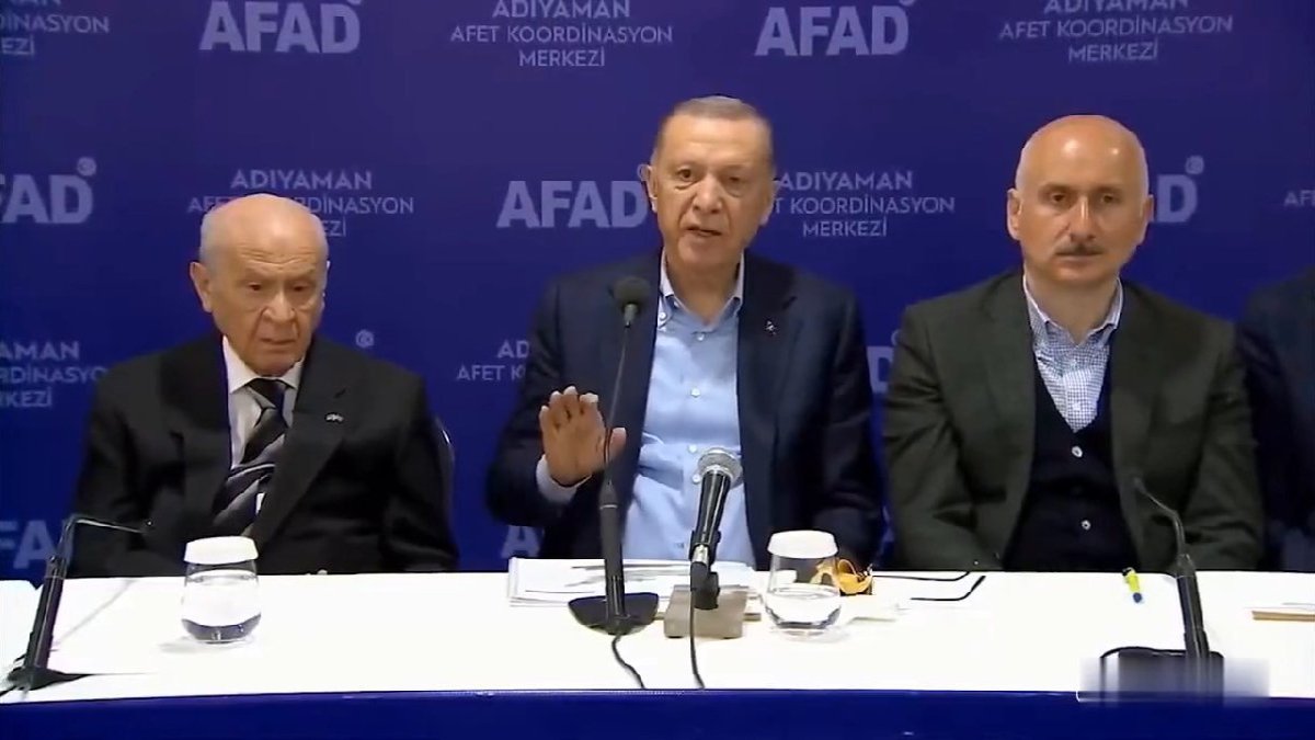 Cumhurbaşkanı ve AKP Genel Başkanı Recep Tayyip Erdoğan, MHP lideri Devlet Bahçeli’yle birlikte deprem bölgesi Adıyaman’ı ziyaret etti. Deprem sonrası yürütülen çalışmalarla ilgili incelemelerde bulunan Erdoğan, daha sonra AFAD Adıyaman Afet Koordinasyon Merkezi’nde açıklamalarda bulundu.