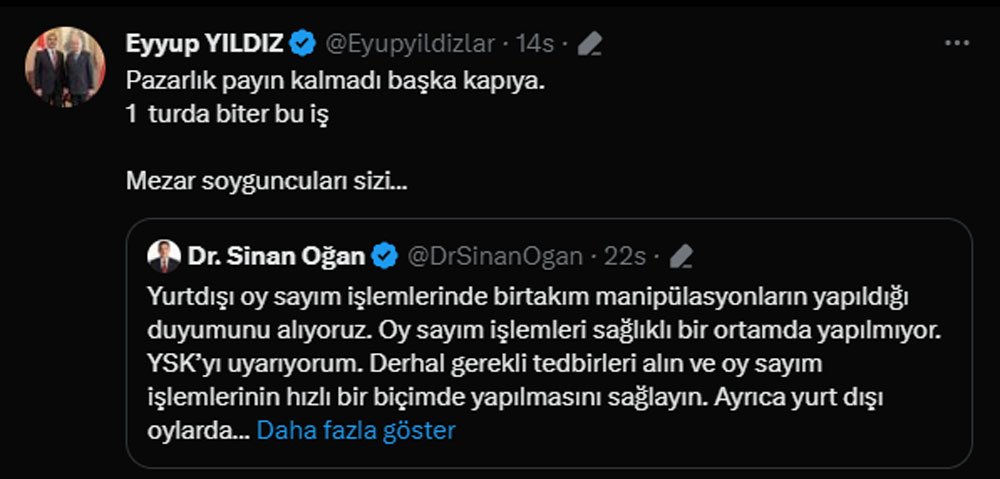 Henüz sonuçlar kesinleşmemişken MHP Genel Başkanı Devlet Bahçeli'nin Başdanışmanı Eyyüp Yıldız'dan Sinan Oğan'a hakaret dolu bir yanıt geldi. Oğan'ın paylaşımını alıntılayan Yıldız "Pazarlık payın kalmadı başka kapıya. 1. turda biter bu iş. Mezar soyguncuları sizi..." dedi. Yıldız, ilerleyen saatlerde seçimin ikinci tura kalmasıyla söz konusu paylaşımını sildi. MHP’den, Ankara 1. Bölge 3. sıra adayı da olan Yıldız, Meclis'e giremedi.