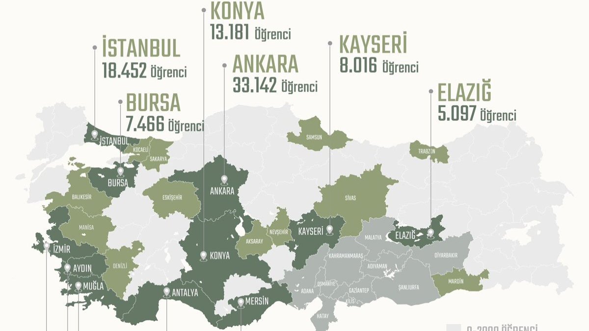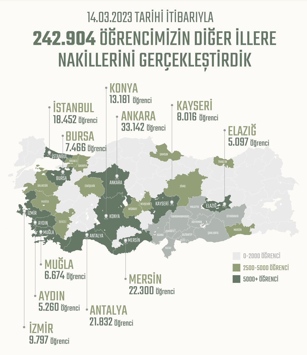 Özer paylaştığı nakil haritasıyla hangi ile kaç öğrenci nakledildiğini de duyurdu. Haritaya göre; Ankara'ya 33 bin 142, Mersin'e 22 bin 300, Antalya'ya 21 bin 832, İstanbul'a 18 bin 452, Konya'ya 13 bin 181, İzmir'e 9 bin 797, Kayseri'ye 8 bin 16, Bursa'ya 7 bin 466, Muğla'ya 6 bin 674, Elazığa 5 bin 97 ve Aydın'a 5 bin 260 öğrencinin nakli gerçekleştirildi.