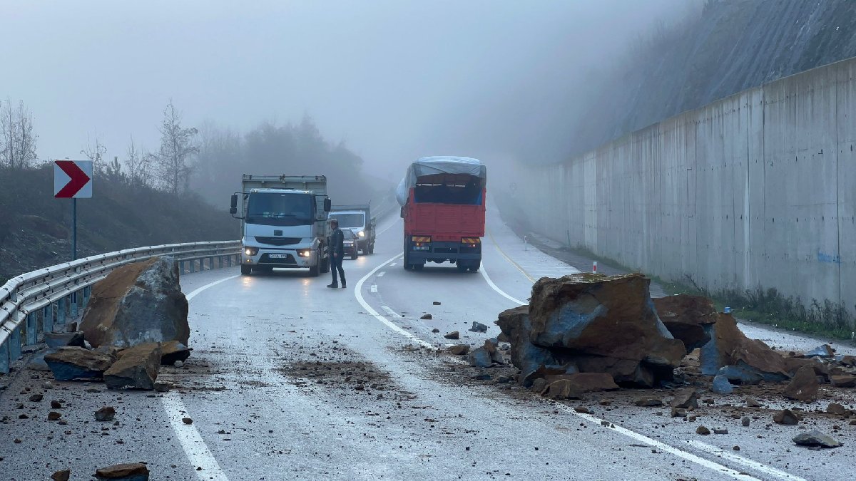 Bartın- Karabük yolunda, Kirazlıköprü Barajı mevkisinde sabah saatlerinde yamaçtan kopan kayalar, yola düştü.