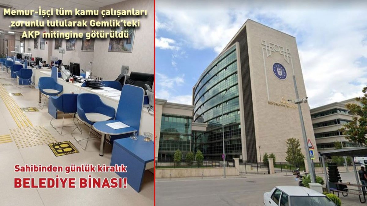 AKP'li Bursa Büyükşehir Belediyesi, personeline Cumhurbaşkanı Recep Tayyip Erdoğan’ın 24 Nisan Pazartesi günü Gemlik’te yapacağı AKP mitingine katılma zorunluluğu getirince belediye binası boşaldı, işler durdu. Belediyenin boş ofislerinin fotoğrafını paylaşan CHP Bursa İl Başkanı Turgut Özkan, altına da "Sahibinden günlük kiralık belediye" notunu düştü.