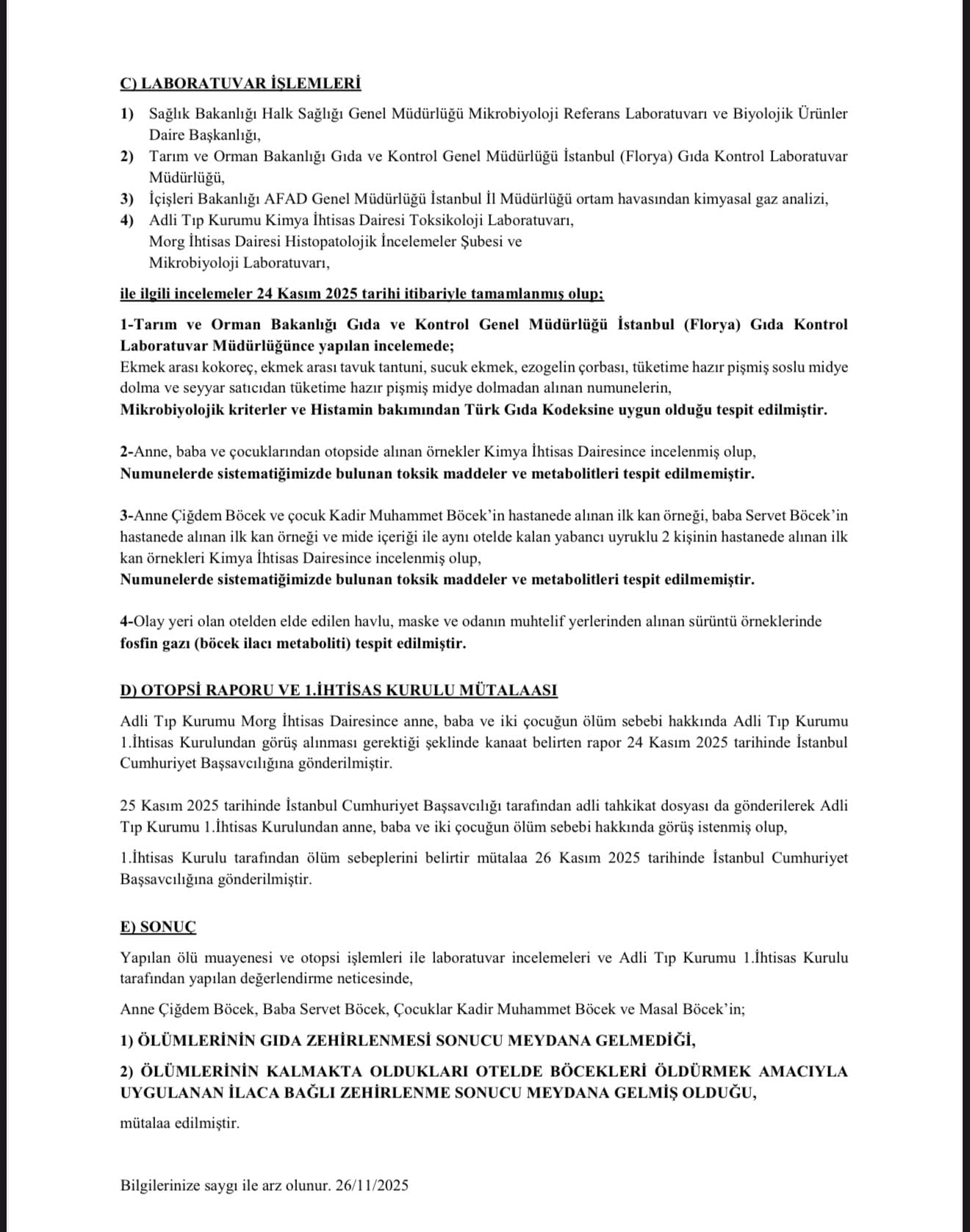 Adli Tıp Kurumunca hazırlanan raporda, 'Adli Tıp Kurumu Morg İhtisas Dairesince anne, baba ve iki çocuğun ölüm sebebi hakkında Adli Tıp Kurumu 1. İhtisas Kurulu’ndan görüş alınması gerektiği yönünde kanaat belirten rapor, 24 Kasım 2025 tarihinde İstanbul Cumhuriyet Başsavcılığı’na gönderilmiştir. 25 Kasım 2025 tarihinde İstanbul Cumhuriyet Başsavcılığı tarafından adli tahkikat dosyası da gönderilerek Adli Tıp Kurumu 1. İhtisas Kurulu’ndan anne, baba ve iki çocuğun ölüm sebebi hakkında görüş istenmiş olup, 1. İhtisas Kurulu tarafından ölüm sebeplerini belirtir mütalaa 26 Kasım 2025 tarihinde İstanbul Cumhuriyet Başsavcılığı’na gönderilmiştir. Yapılan ölü muayenesi ve otopsi işlemleri ile laboratuvar incelemeleri ve Adli Tıp Kurumu 1. İhtisas Kurulu tarafından yapılan değerlendirme neticesinde; Anne Çiğdem Böcek, baba Servet Böcek, çocuklar Kadir Muhammet Böcek ve Masal Böcek’in; Ölümlerinin gıda zehirlenmesi sonucu meydana gelmediği, Ölümlerinin, kalmakta oldukları otelde böcekleri öldürmek amacıyla uygulanan ilaca bağlı zehirlenme sonucu meydana gelmiş olduğu mütalaa edilmiştir' yazıldı.