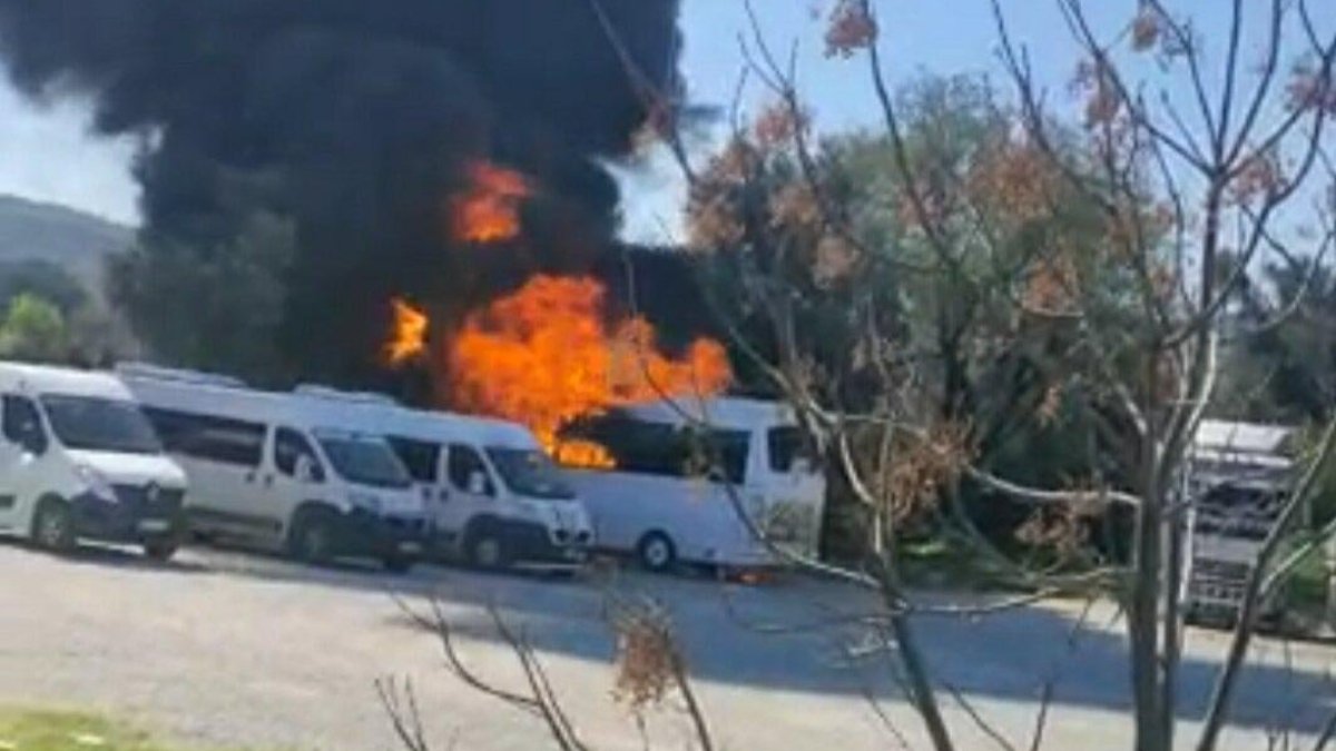 Ortakent pazar yerinin otoparkında, saat 12.30 sıralarında, park halindeki 48 S 1258 plakalı okul servisinin sürücüsü, motoru çalıştırmak için marşa bastı. Sürücü, kontak anahtarını çevirdiği sırada motordan önce duman ardından da alevler çıktı.