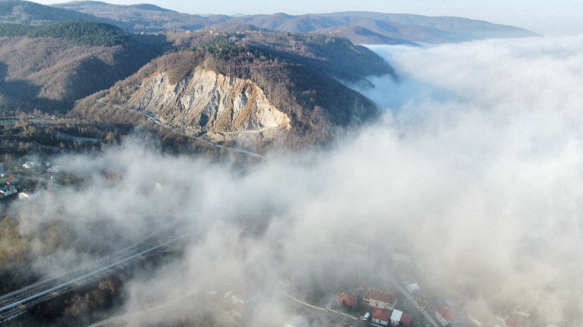 Sis nedeniyle D-100 kara yolu Bolu Dağı çıkışı Üçköprü, Doğanlı ve Kaynaşlı kesimlerinde görüş mesafesi azaldı. Bu arada Bolu Dağı'nın eteklerinde oluşan sis tabakası dronla görüntülendi. (AA)