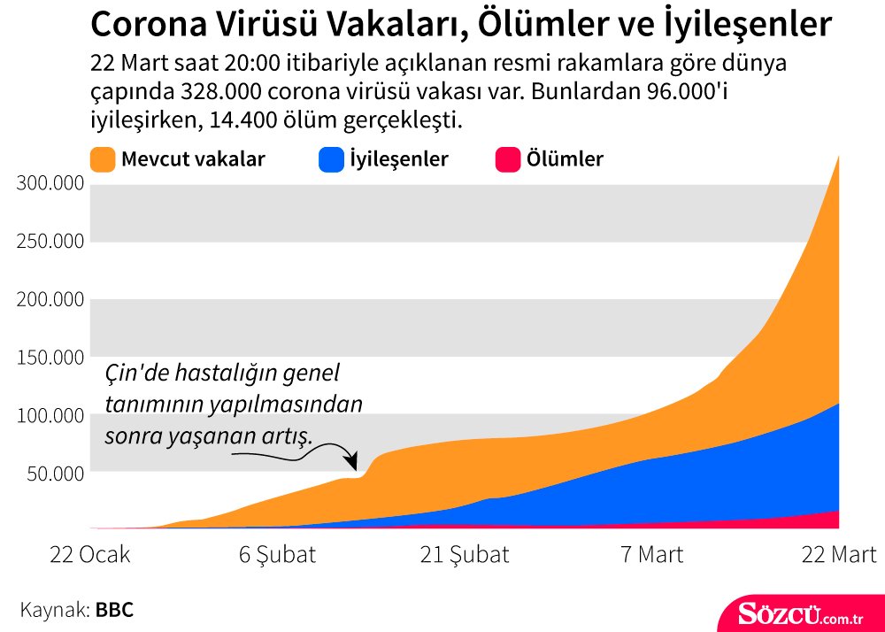 ABD'de bulunan John Hopkins University'nin verilerine göre; Türkiye'deki corona virüsü bağlantılı (Covid-19) vaka ve ölüm sayısını anlık olarak görebilirsiniz. Canlı grafiğin sağ ve sol altındaki okları kullanarak dünya genelindeki veri ve istatistiklere ulaşabilirsiniz.