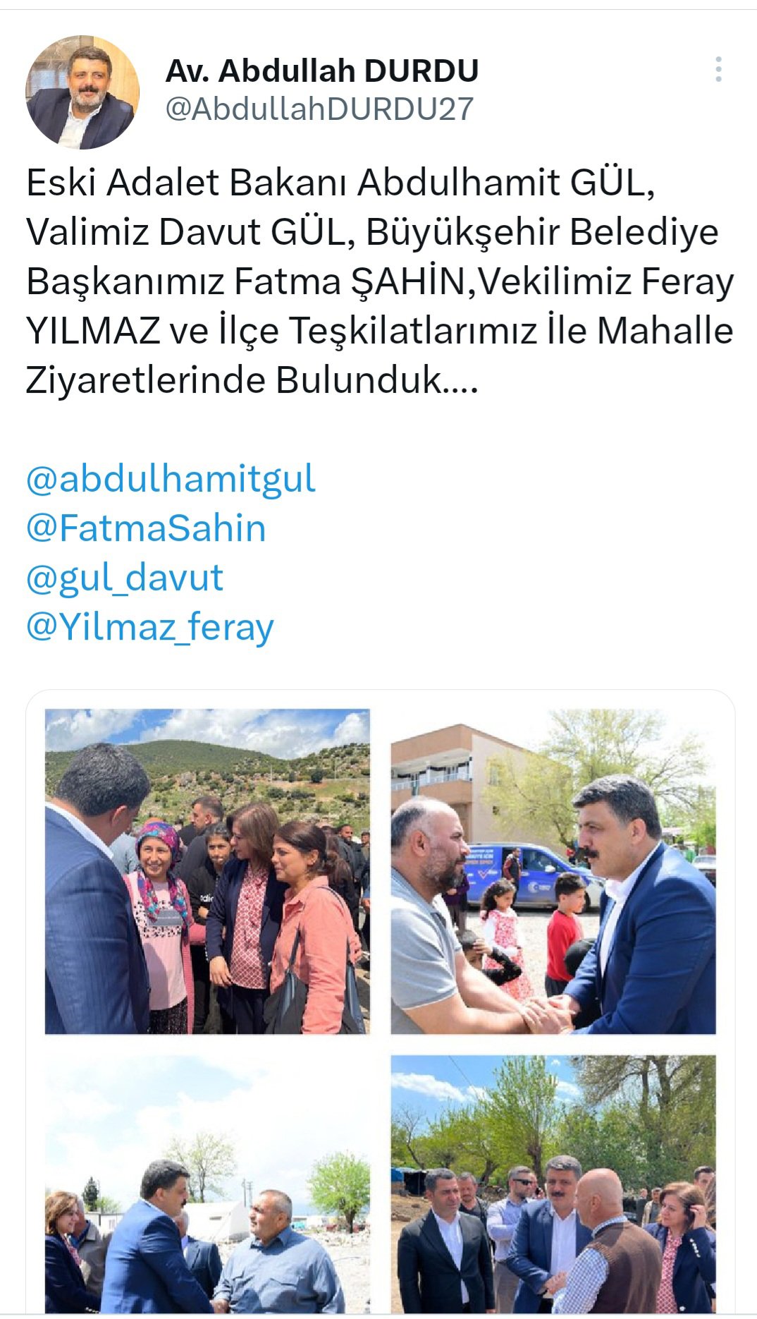 Bir tepki çeken paylaşım ise, AKP Gaziantep Milletvekili Adayı Abdullah Durdu tarafından yapıldı. Durdu sosyal medya hesabından, “Eski Adalet Bakanı Abdulhamit Gül, Valimiz Davut Gül, Büyükşehir Belediye Başkanımız Fatma Şahin, vekilimiz Feray Yılmaz (Aday) ve ilçe teşkilatlarımız ile mahalle ziyaretlerinde bulunduk” notuna yer verdi.