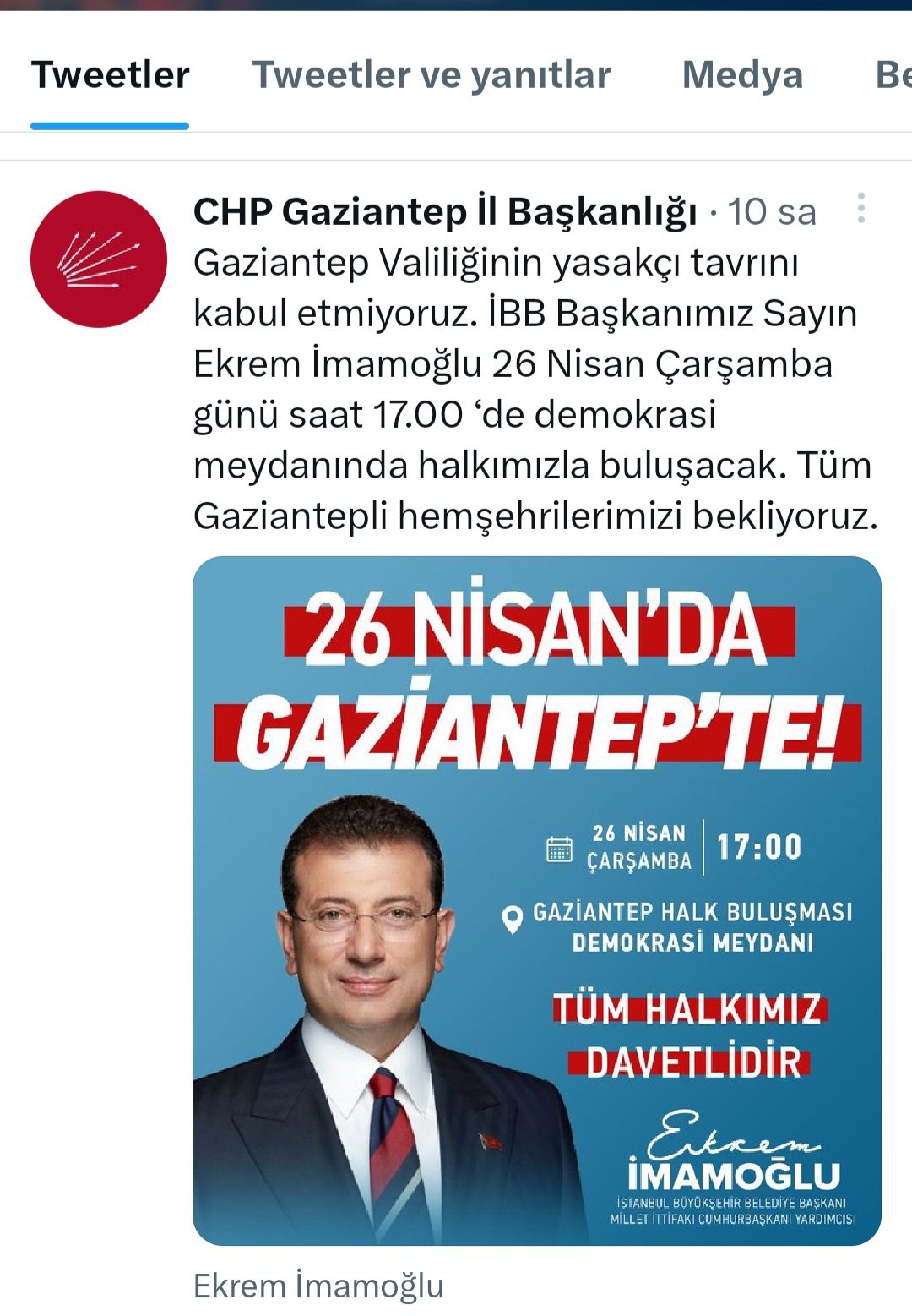 Bu arada Gaziantep Valiliği ile CHP Gaziantep İl Başkanlığı arasında İstanbul Büyükşehir Belediye Başkanı Ekrem İmamoğlu’nun yarın (26 Nisan) Gaziantep’te düzenleyeceği miting konusunda yer krizi yaşanmaya devam ediyor. CHP’nin Demokrasi Meydanı’nda miting isteği valilik tarafından, 18 Ocak 2023 tarihinde belirlenen toplantı ve miting alanı dışında olduğu gerekçesiyle kabul edilmedi. CHP ise sosyal medya hesaplarından miting yeri olarak valiliğin uygun olmadığı açıklamasına rağmen Demokrasi Meydanı olarak duyurulmaya devam ediliyor.