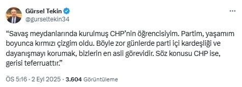 Gürsel Tekin sosyal medya hesabından bir mesaj da paylaştı. Tekin'in paylaşımında şu ifadeler yer aldı: