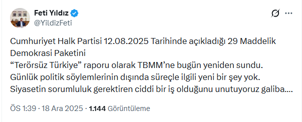MHP Hukuk ve Seçim İşlerinden Sorumlu Genel Başkan Yardımcısı Feti Yıldız sosyal medyadan yaptığı açıklamada, "Cumhuriyet Halk Partisi 12.08.2025 Tarihinde açıkladığı 29 Maddelik Demokrasi Paketini “Terörsüz Türkiye” raporu olarak TBMM’ne bugün yeniden sundu" ifadelerini kullanırken şunları söyledi: