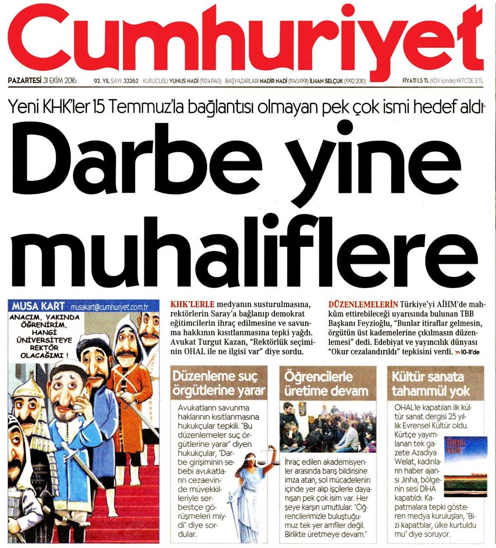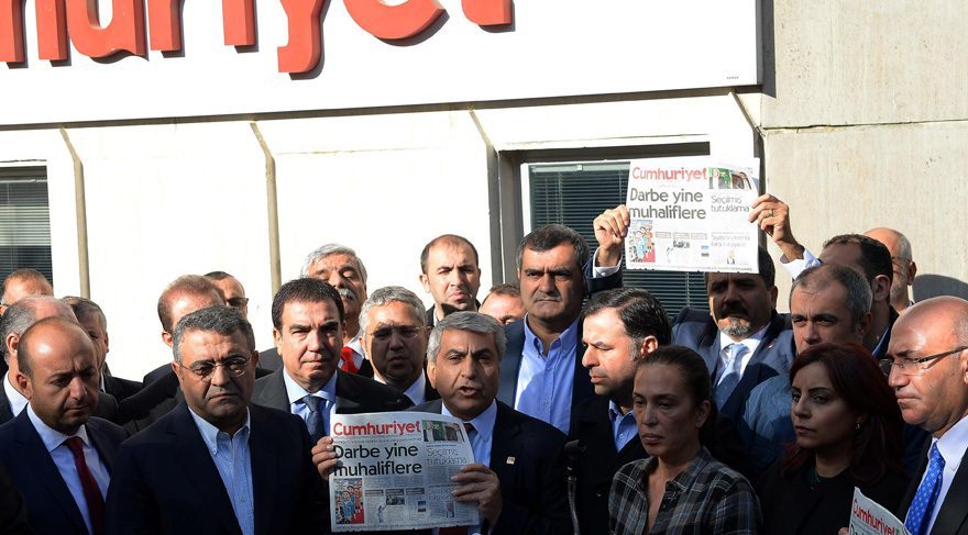 Cumhuriyet Gazetesi yönetim kadrosuna düzenlenen operasyon kapsamında; gazetenin genel yayın yönetmeni Murat Sabuncu, Cumhuriyet Vakfı Başkanı Akın Atalay, yazar Hikmet Çetinkaya, yazar Engin Aydın, yazar Güray Öz, yazar Hakan Kara, gazeteci Nebil Özgentürk, karikatürist Musa Kart, avukat Bülent Utku, avukat Mustafa Kemal Güngör, vakıf yöneticisi Önder Çelik, Bülent Yener, mali müşavir Eser Sevinç ve eski genel yayın yönetmeni Can Dündar ve gazeteci Orhan Erinç hakkında gözaltı kararı çıkarıldı.