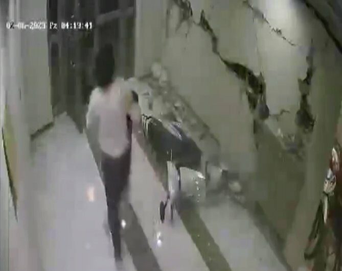 Çocuklarını da yanlarına alan aileler kaçarken, binanın sıvaları döküldü. Bu anların güvenlik kamerasına yansıyan görüntüleri ortaya çıktı.