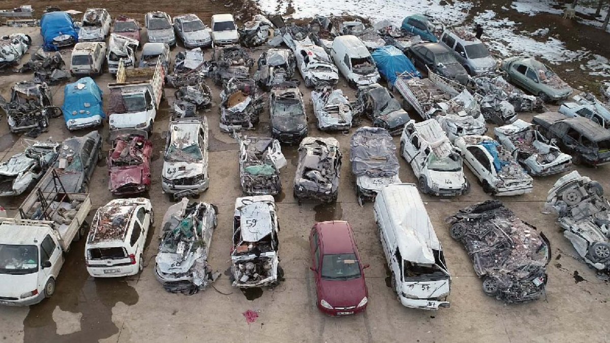 Kahramanmaraş'ın Elbistan ilçesinde, depremde hasar görüp, boş araziye çekilen araçlar, dronla havadan görüntülendi.