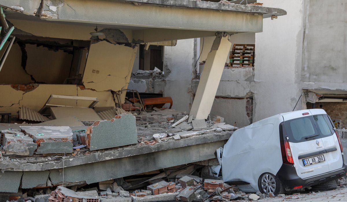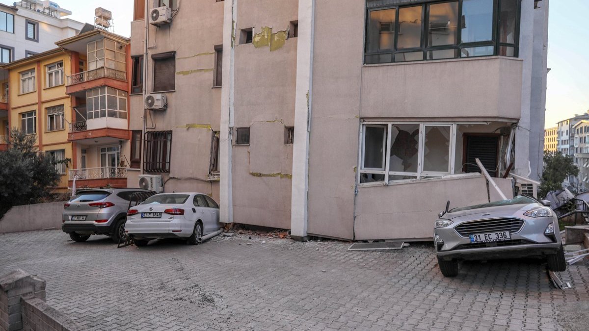 Antakya ilçesindeki binanın, otoparktaki 3 otomobilin üzerine doğru devrildiği, yine aynı ilçede yan yatan evin de sokakta park halindeki araca doğru çöktüğü görüldü. (DHA)