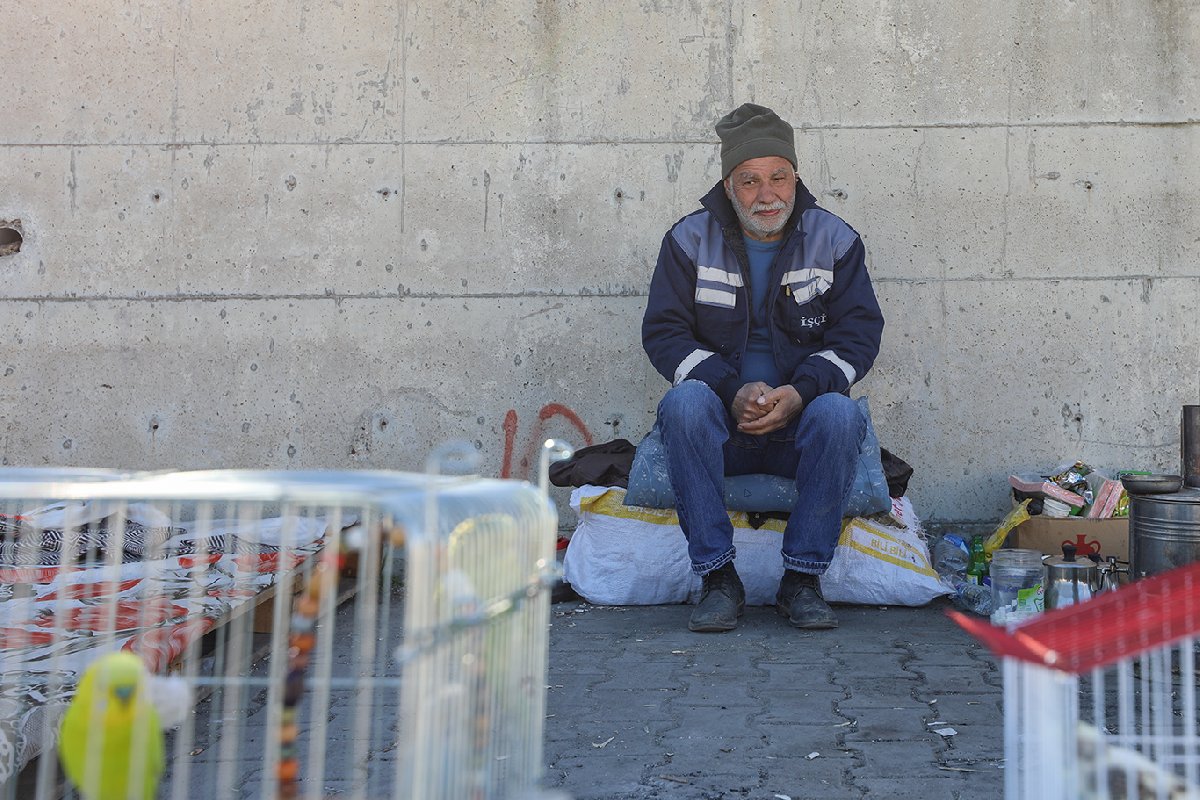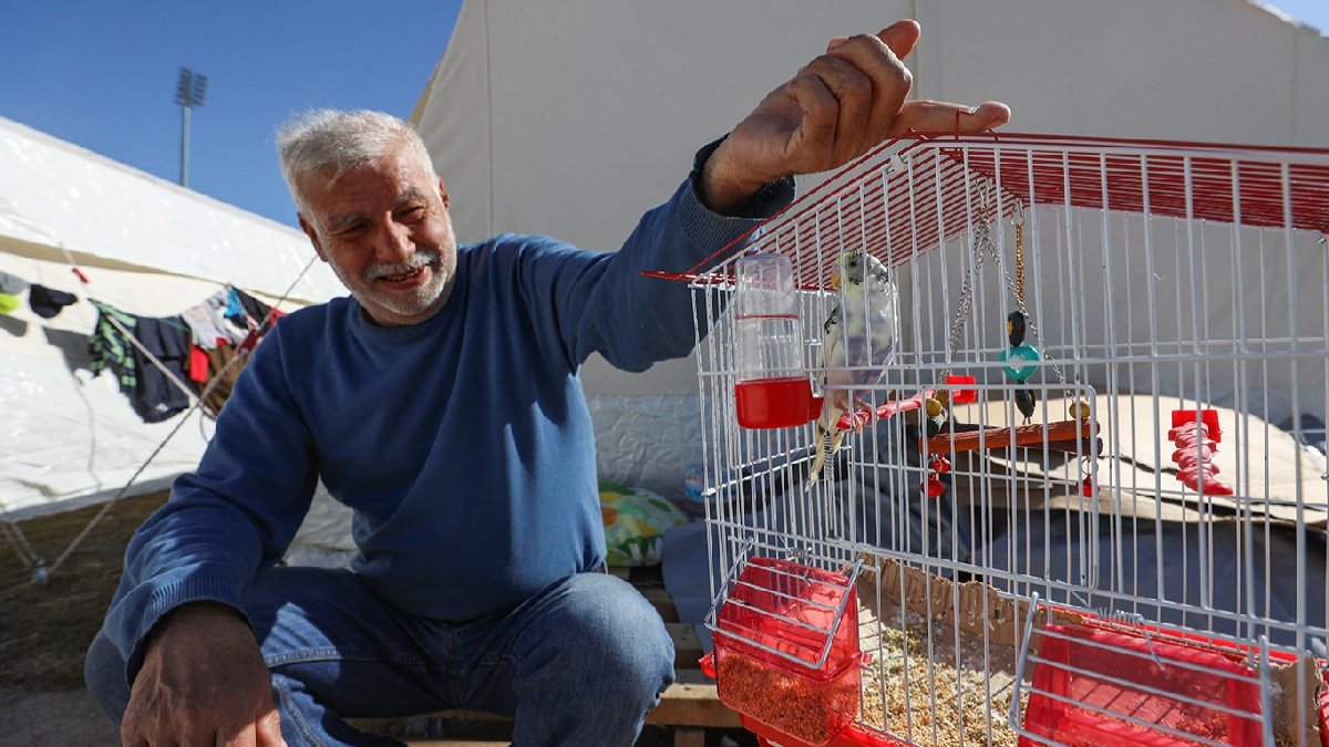 Depremde hasar gören evinden muhabbet kuşlarını kurtaran afetzede Ahmet Salim Karahan da sığındıkları çadır kentte onlarla teselli bulduğunu söyledi. (AA)