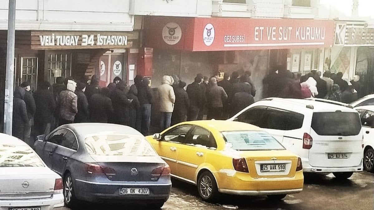Kasapta kıymanın kilo fiyatı 150-200 liraya yükselince Erzurum’da vatandaşlar eksi 12 derece soğuk altında kıymanın kilosunu 89 liradan satan Et ve Süt Kurumu'nun önünde kuyruklar oluşturuyor. Bir kilo eti, daha ucuza alabilmek için sabahın erken saatlerinde kuyruğa giren vatandaşlardan bazıları da istedikleri ürünleri bulamayınca eli boş geri dönüyorlar.
