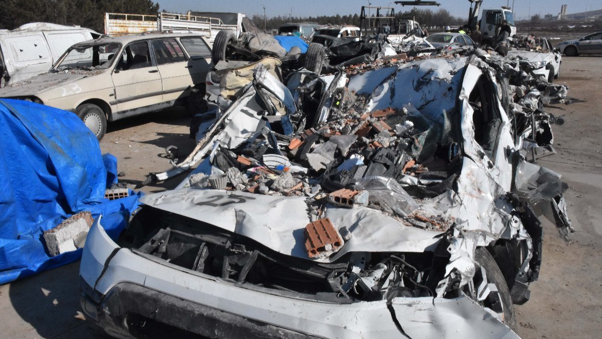 Araçların görüntüsü, depremin şiddetini adeta gözler önüne seriyor. Otoparka getirilen araçların kaydını ise bölgede bulunan trafik ekipleri yapıyor. (AA)