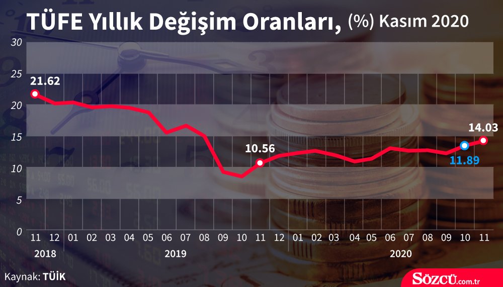 TÜFE'de  2020 yılı Kasım ayında bir önceki aya göre yüzde 2,30, bir önceki yılın Aralık ayına göre yüzde 13,19, bir önceki yılın aynı ayına göre yüzde 14,03 ve on iki aylık ortalamalara göre yüzde 12,04 artış gerçekleşti.