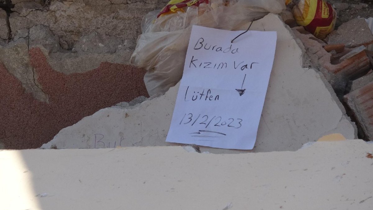 Enkazın üzerine, depremden kurtulan kişi tarafından yazıldığı tahmin edilen 'Burada kızım var lütfen. 13.02.2023' yazılı not görenleri duygulandırdı. (DHA)