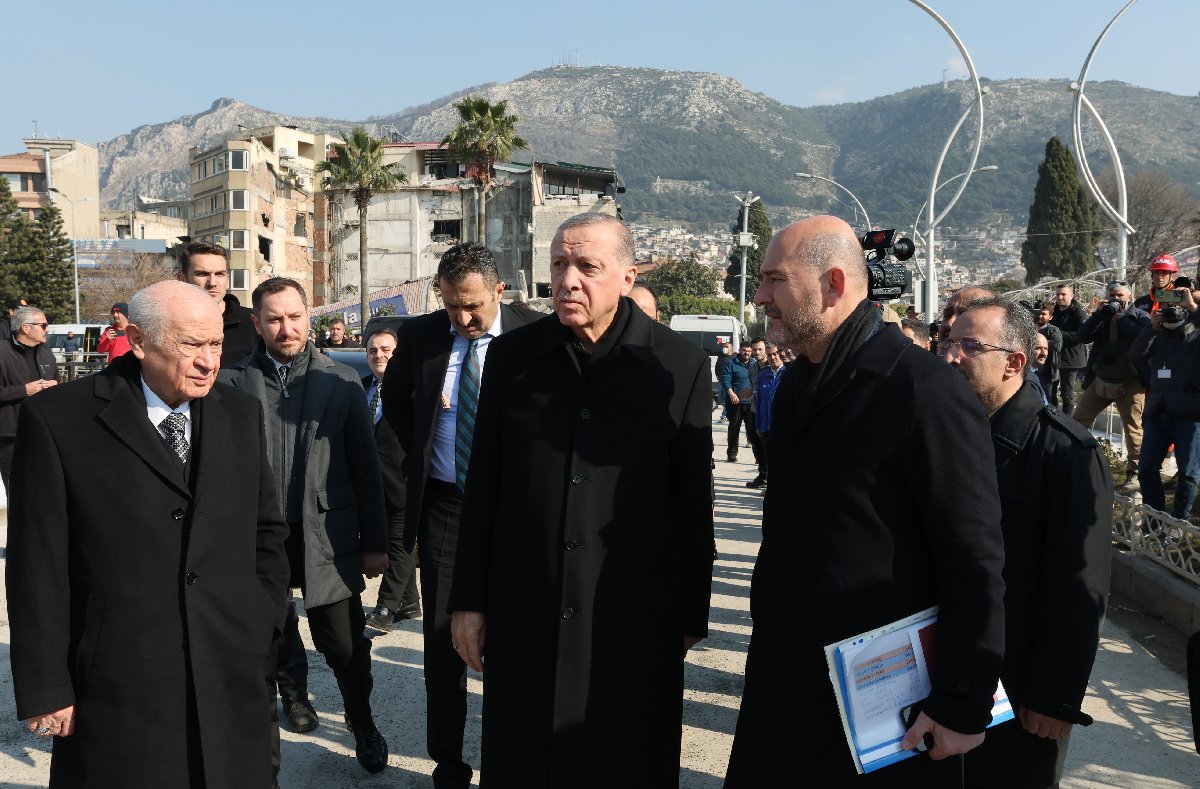 Cumhurbaşkanı ve AKP Genel Başkanı Recep Tayyip Erdoğan ile MHP Genel Başkanı Devlet Bahçeli, bugün birlikte Hatay'a giderek Antakya ilçesindeki Atatürk Caddesi'nde incelemelerde bulundu.