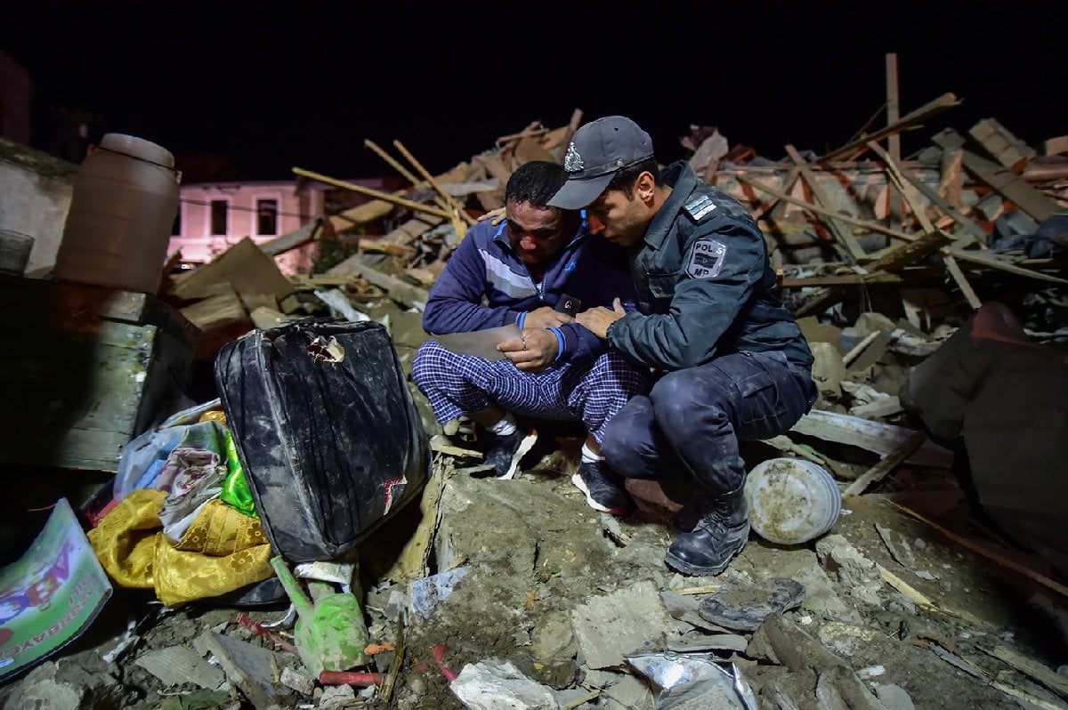 Ermeni güçlerinin Gence'ye attığı füzelerden biri, çok katlı binaya isabet etti. Onlarca ailenin yaşadığı bina tamamen yıkıldı. Enkaz altında kalan sivilleri kurtarma çalışmaları devam ediyor.