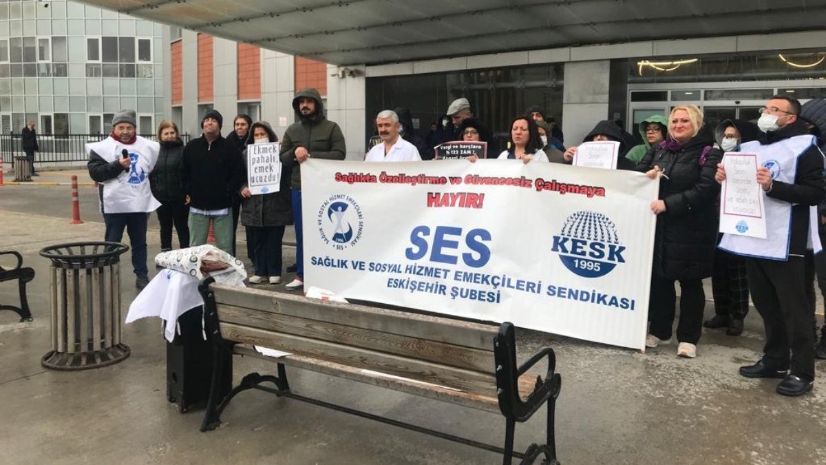 SES Eskişehir Şubesi üyesi sağlık emekçileri, Eskişehir Yunus Emre Devlet Hastanesi Poliklinikler önünde toplanarak kamu emekçilerine ve emeklilere verilen yüzde 30’luk zammı protesto etti.