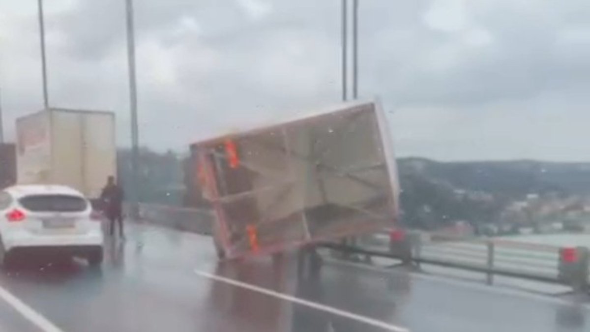 Fatih Sultan Mehmet Köprüsü üzerinde sabah saatlerinde, Avrupa'dan Anadolu yakasına geçen kamyonete bağlı boş römork, köprü üzerinde sert rüzgar nedeniyle yan yattı.