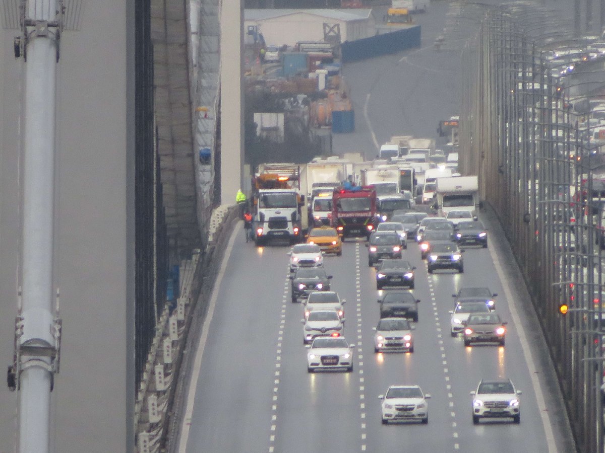 Köprünün çelik halatlarına doğru yan yatan römorkun, denize uçmaması için halatla bağlandı.