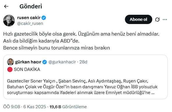 Gazeteci Gürkan Hacır, X'te operasyona ilişkin yaptığı paylaşımda, "Gazeteciler Soner Yalçın , Şaban Sevinç, Aslı Aydıntaşbaş, Ruşen Çakır, Batuhan Çolak ve Özgür Özel’in basın danışmanı Yavuz Oğhan İBB yolsuzluk soruşturması kapsamında ifadeleri alınmak üzere Emniyet müdürlüğü’ne götürüldüler" ifadelerini kullanmıştı.