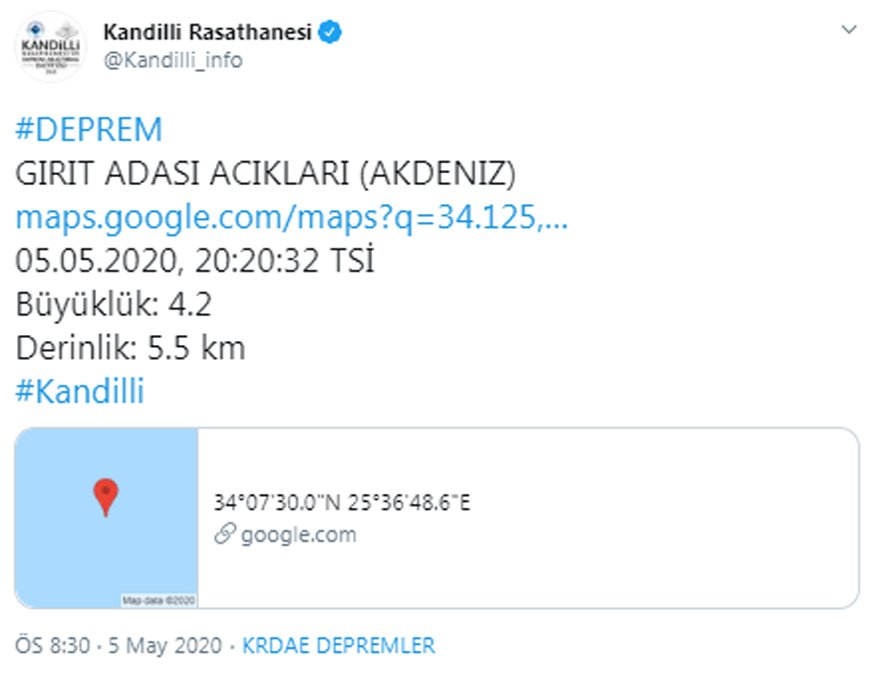 2 Mayıs'ta Girit Adası'nın açıklarında saat 15.51'de yerin 17.9 kilometre derinliğinde 6.4 büyüklüğünde bir deprem meydana gelmişti.