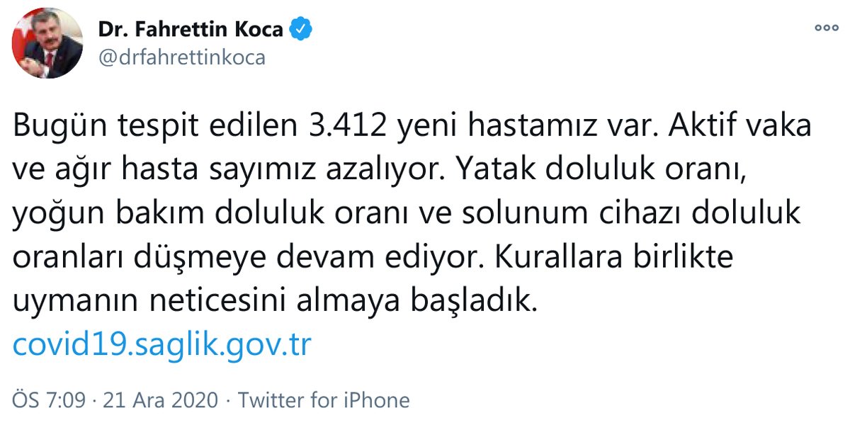 Sosyal medya hesabından güncel corona virüsü verilerini paylaşan Sağlık Bakanı Fahrettin Koca, aktif vaka ve ağır hasta sayısının azaldığını belirtti.