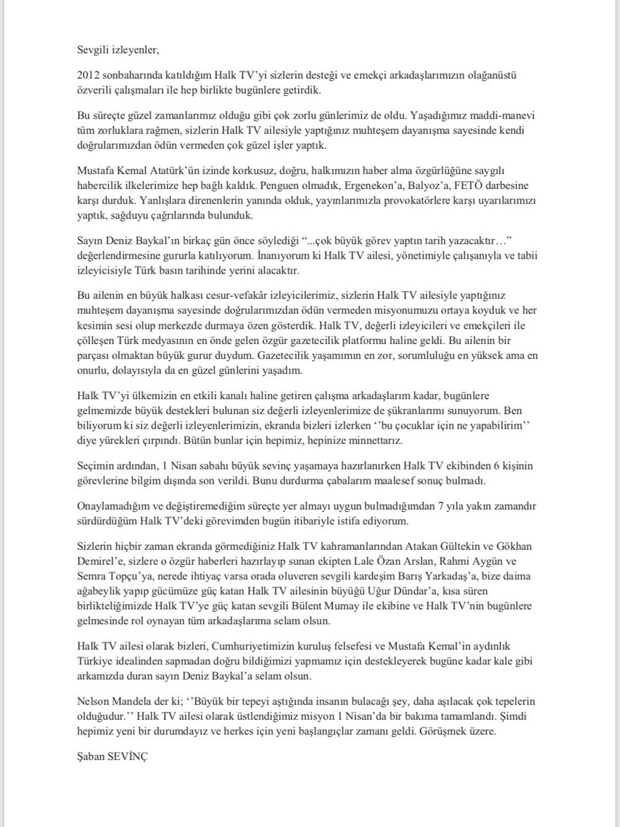 İşte Sevinç'in "İstifamdır... Değerli Halk TV izleyenlerine" başlıklı o açıklaması;