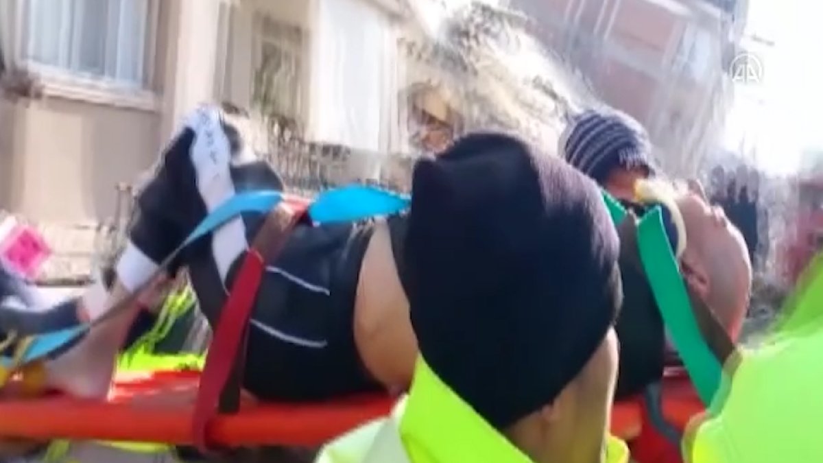 Sedyeye yerleştirilen depremzede kadın, sağlık görevlilerine teslim edildi. Ekipleri gören kadının yıkıntılar arasından gülümseyen yüzü ekipleri duygulandırdı.