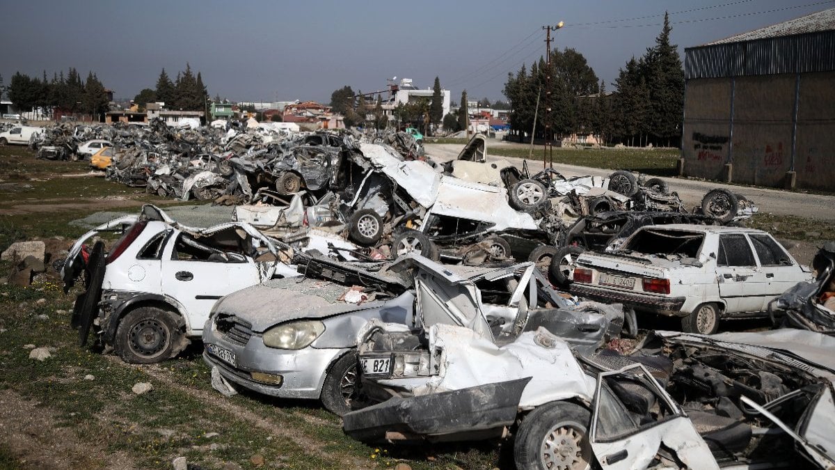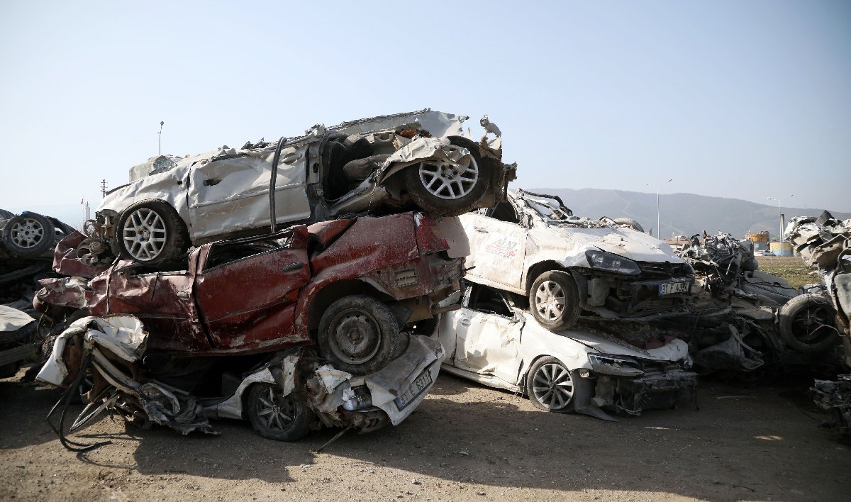 Antakya ve Samandağ'daki enkaz kaldırma çalışmalarında moloz yığınlarının arasından çıkarılan araçlar, çekicilerle bölgede belirlenen 3 hasarlı araç toplama alanına taşınıyor. 'Araç mezarlığı'na dönüşen alanlarda büyük hasar almış yüzlerce araç bulunuyor.
