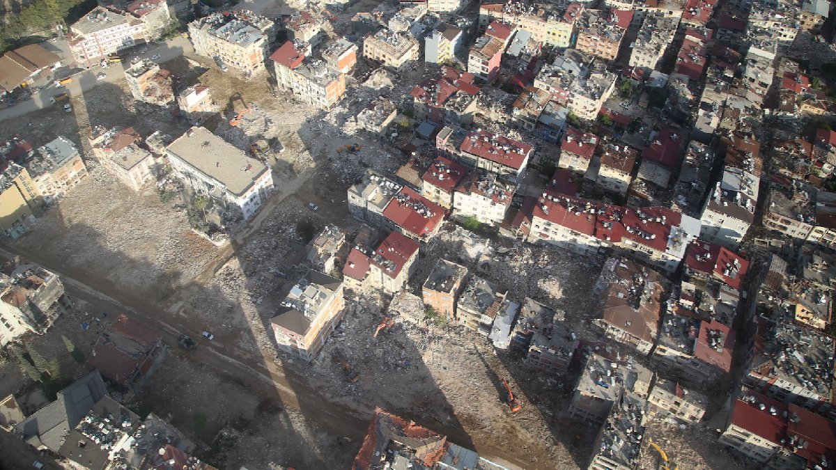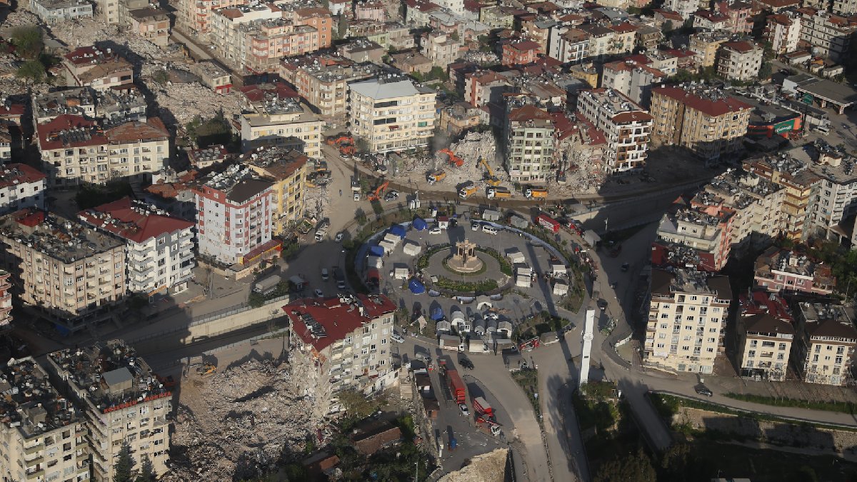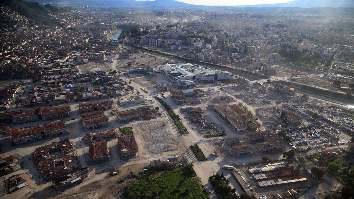 Kahramanmaraş ve Hatay merkezli depremlerin ardından Antakya, Defne ve Kırıkhan ilçelerinde yıkılmış veya ağır hasarlı çok sayıda bina, helikopterden görüntülendi.