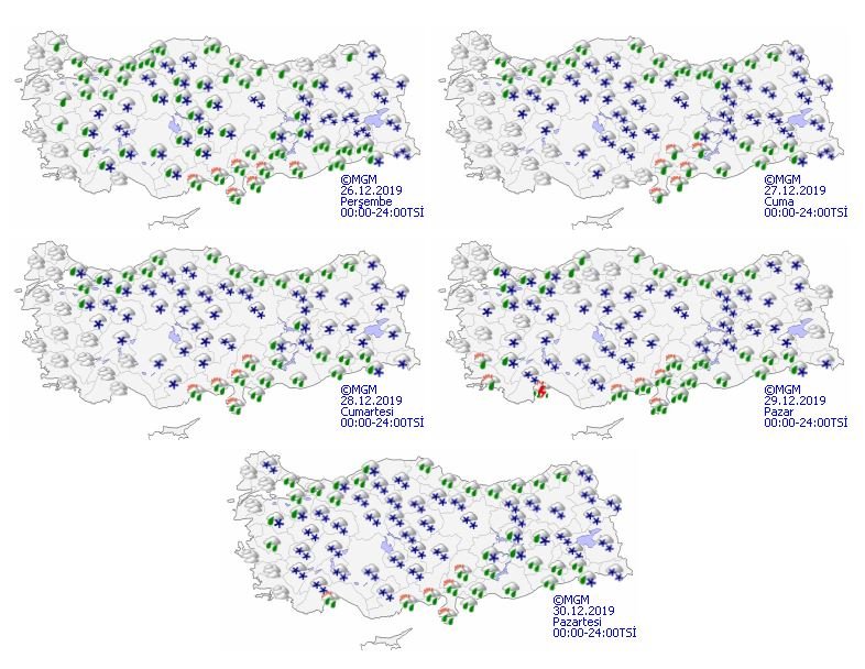 Meteoroloji Genel Müdürlüğü tarafından yapılan son değerlendirmelere göre: Marmara’nın doğusu, Kuzey Ege'nin iç kesimleri, Doğu Akdeniz, İç Anadolu, Karadeniz, Doğu ve Güneydoğu Anadolu ile Isparta ve Antalya çevrelerinin yağışlı geçeceği tahmin ediliyor. Yağışların; genellikle yağmur ve sağanak, Karadeniz’in iç kesimleri, İç ve Doğu Anadolu ile Kütahya, Afyonkarahisar, Isparta ve Kahramanmaraş çevreleri ile Akdeniz’in iç kesimlerinin yükseklerinde karla karışık yağmur ve yer yer kar şeklinde olması bekleniyor. Yağışların Doğu Anadolu’nun güneyi, Güneydoğu Anadolu’nun kuzey ve doğusu ile Kahramanmaraş, Zonguldak, Bartın ve Düzce çevrelerinde kuvvetli olması bekleniyor.