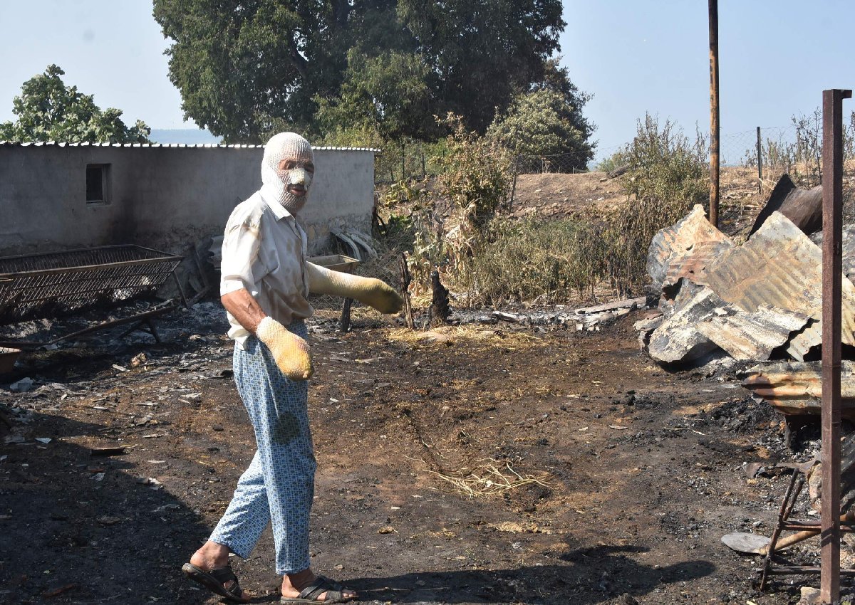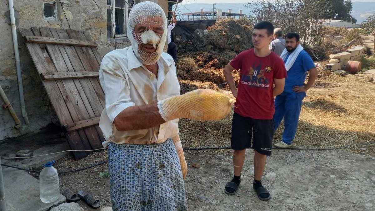 Demir, ormandan ateşin sıçramasıyla alev topuna dönen ahırında hayvanlarını kurtarmak isterken yaralandı. Yüzünde ve ellerinde yanıklar oluşan Demir, hastanedeki tedavisinin ardından yaralı yerleri sargılı şekilde köyüne döndü.