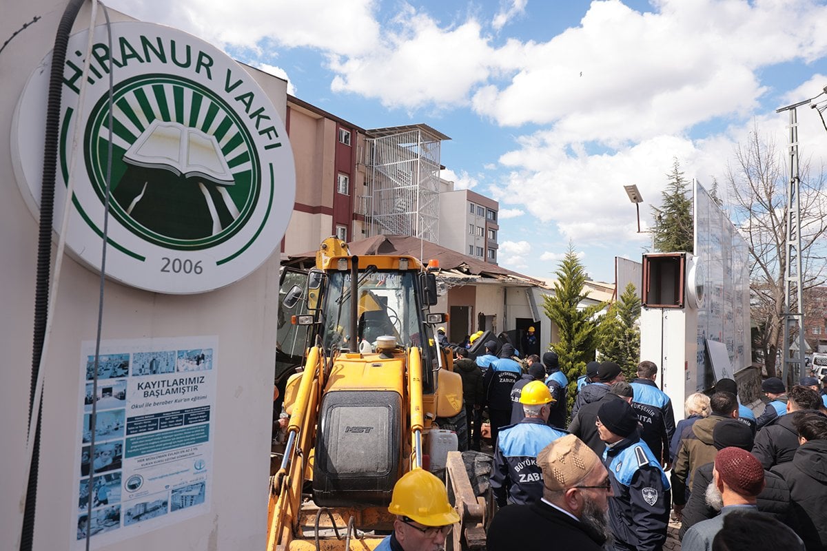 İstanbul Büyükşehir Belediyesi ekipleri vakfın kaçak bölümünü iş makinesi ile yıkarken cemaat mensupları yıkımın hukuksuz olduğunu savunarak görevlilere engel olmaya çalıştı.