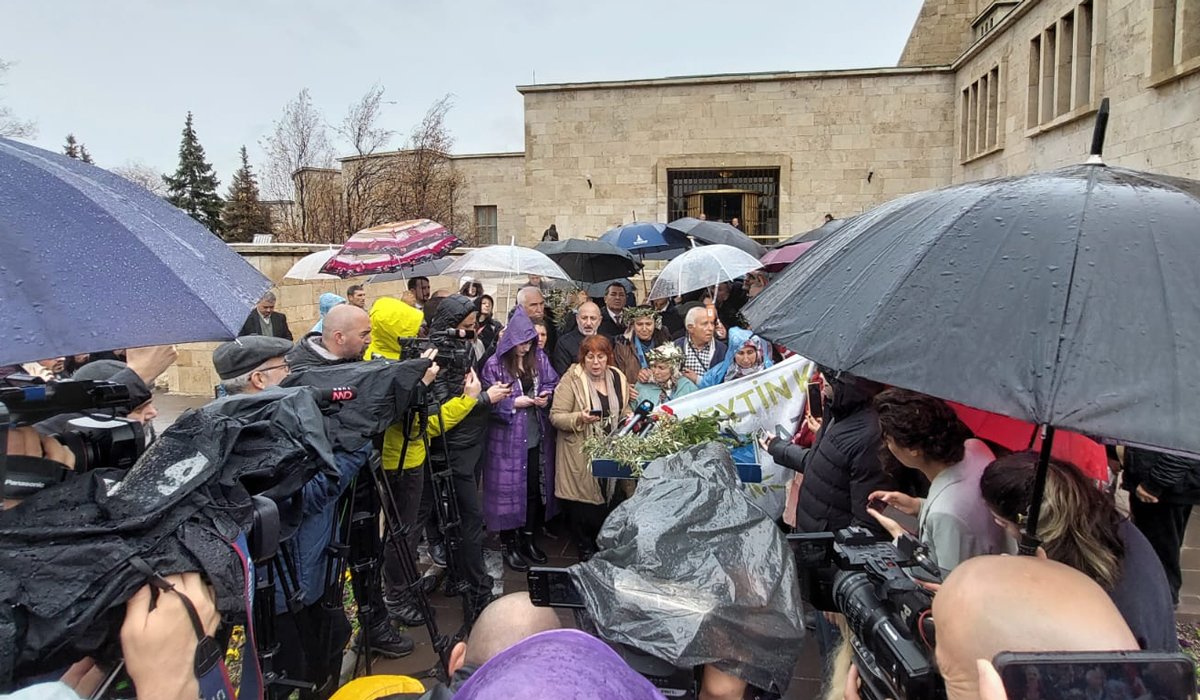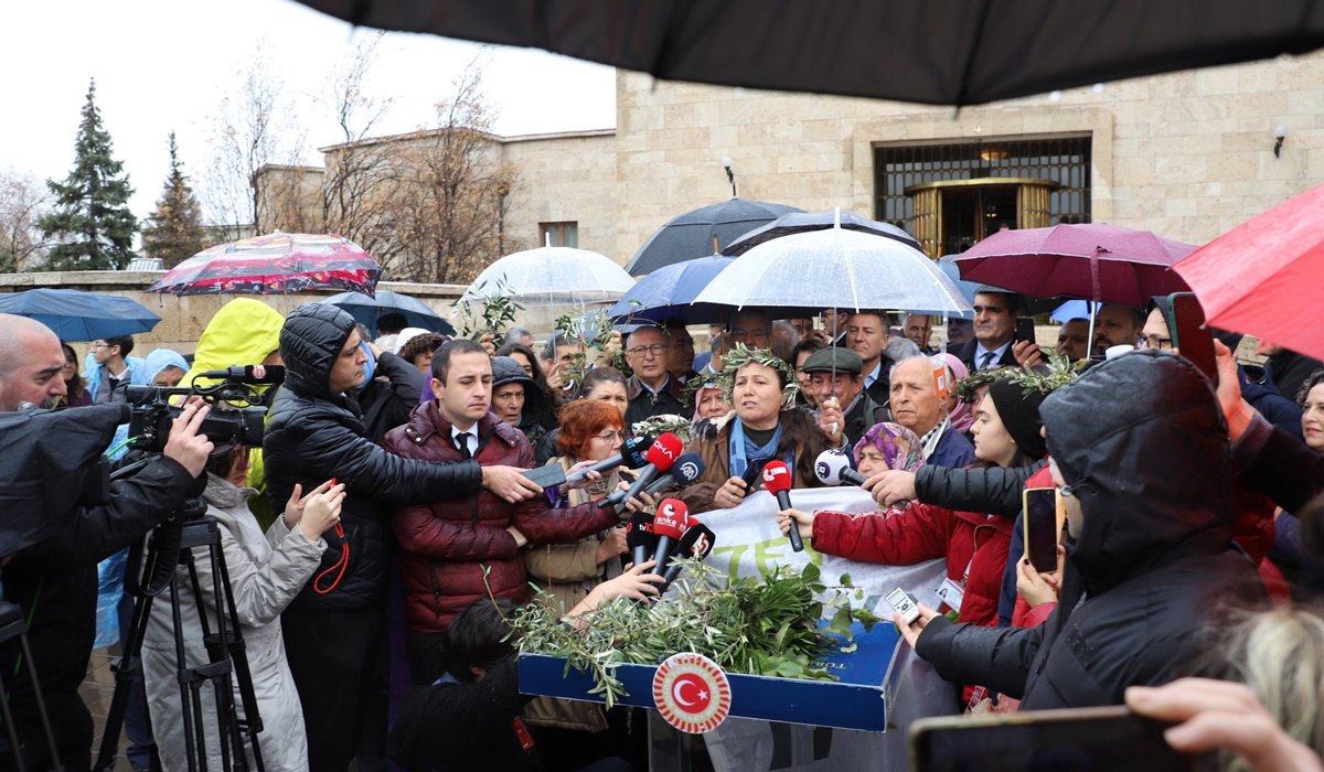 Köylüler daha sonra TBMM'nin Çankaya kapısı önünde 'Zeytin için adalet' yazılı pankart açarak basın açıklaması yaptı.