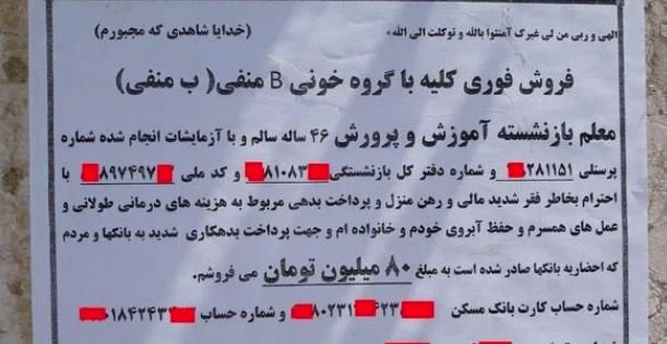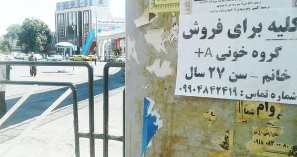 Bazı ilanların fotokopiyle çoğaltıldığı görülüyor. Fotoğraf: NCRIAsghar, "Eğer zorunda olmasaydım böbreğimi satmazdım. Fabrikada çalışıyorum fakat ay sonunu getiremiyorum. Patronum da insanların artık ürettiğimiz kıyafetleri almadığını söyledi ve maaş vermedi. Bazı kişiler de böbreklerim için teklifte bulundu. En yüksek rakam 1500 İngiliz poundu (yaklaşık 11.840 TL)" dedi.