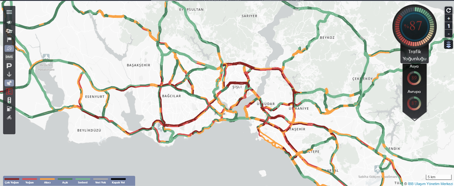 İstanbul Büyükşehir Belediyesi'nin Trafik Yoğunluk Haritası'nın saat 17:15 itibariyle paylaştığı bilgilere göre trafik yoğunluğu yüzde 87'ye çıktı.