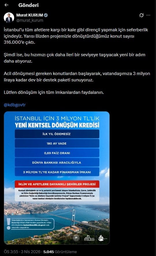 "İstanbul’u tüm afetlere karşı bir kale gibi dirençli yapmak için seferberlik içindeyiz. Yarısı Bizden projemizle dönüştürdüğümüz konut sayısı 316.000’e çıktı. Şimdi ise, bu hızımızı çok daha ileri bir seviyeye taşıyacak yeni bir adım daha atıyoruz. İstanbul, Dünya Bankası finansmanıyla İklim ve Afetlere Dayanıklı Şehirler Projesi şehirler kapsamına alındı. Acil dönüşmesi gereken konutlardan başlayarak, vatandaşımıza 3 milyon liraya kadar dev bir destek paketi sunuyoruz. Lütfen dönüşüm için tüm imkanlardan faydalanın. İnşaat sürerken 1 yıl cebinizden 1 kuruş çıkmayacak. Piyasa şartlarını bir kenara bırakın, zamanı imkanı size göre ayarladık. 180 aya varan ödeme planı sunuyoruz. Aylık 0,69, yıllık yüzde 10'un altında tarihi bir kolaylıkla milletimizin yanında olacağız. İnşaat süresi boyunca yalnız hissetmeyeceksiniz. Yanınızda olacağız. Bugün başvuruları almaya başlayacağız."