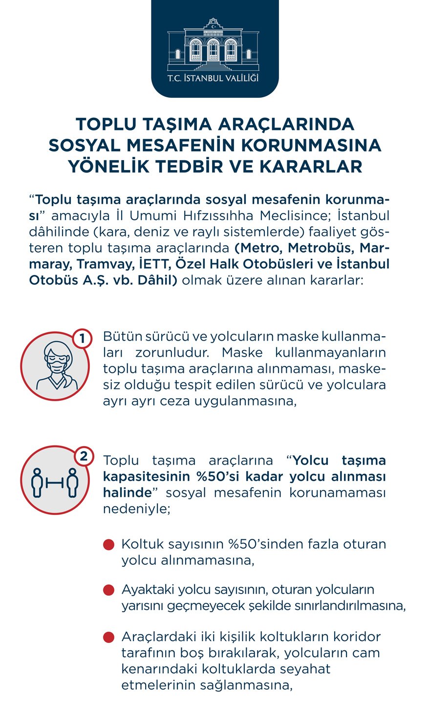 * Toplu taşıma araçlarında sosyal mesafenin korunmasına yönelik tedbir ve kararlar toplu taşıma araçlarında sosyal mesafenin korunması amacıyla İl Umumi Hıfzıssıhha Meclisince, İstanbul dahilinde (kara, deniz ve raylı sistemlerde) faaliyet gösteren toplu taşıma araçlarında (metro, metrobüs, Marmaray, tramvay, İETT, özel halk otobüsleri ve İstanbul Otobüs A.Ş. ve dahil) olmak üzere alınan kararlar: