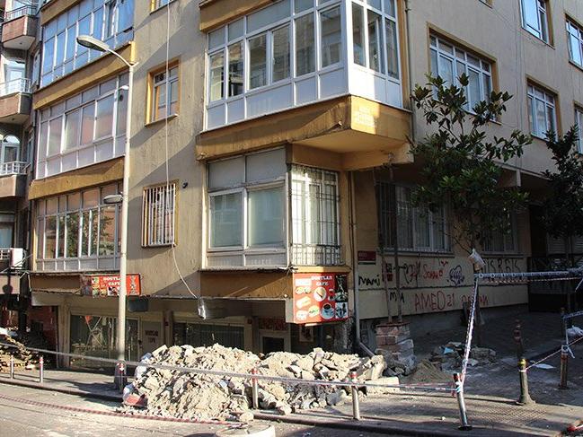 Çevresinde güvenlik önlemi alınan binayla yanındaki bina arasında aralık oluştu.