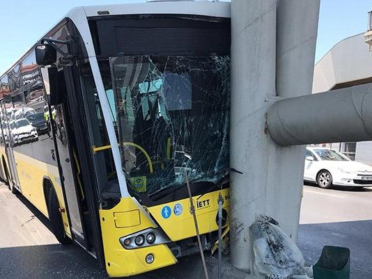 (FOTO: DHA)D-100 Karayolu'nun ortasındaki kaldırıma çıkan otobüs, üst geçidin demir direğine çarparak durabildi.