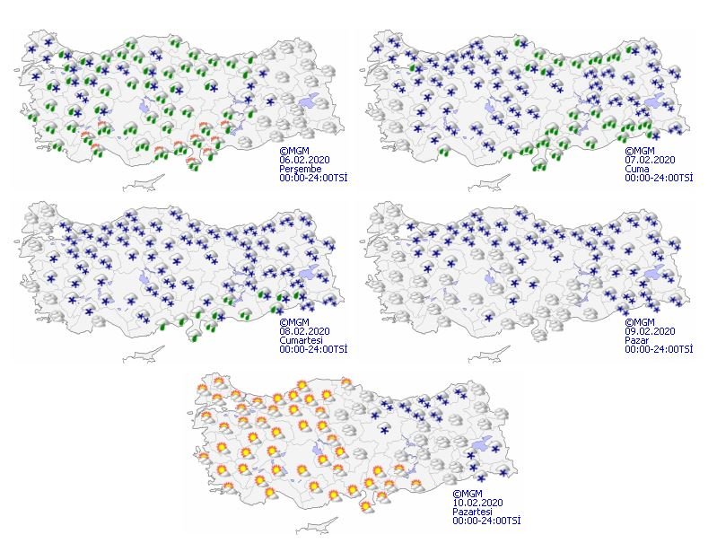 Meteoroloji Genel Müdürlüğü tarafından yapılan son değerlendirmelere göre; Marmara, Ege, Akdeniz, Karadeniz, İç Anadolu, Doğu Anadolu'nun batısı ile Erzurum, Bingöl, Muş,Bitlis, Şırnak, Adıyaman, G. Antep, Kilis, Siirt ve Diyarbakır çevrelerinin yağışlı geçeceği tahmin ediliyor. Genellikle yağmur ve sağanak, Doğu Anadolu'nun batısı, zamanla İç Ege, Batı ve Doğu Karadeniz'in iç kesimleri, İç Anadolu ile Erzurum, Bingöl, Muş, Şırnak ve Bitlis çevrelerinde yer yer karla karışık yağmur ve kar yağışı şeklinde beklenen yağışların; Isparta, Antalya'nın doğu ilçeleri, Mersin, Adana, Karaman ile Konya'nın güney ve batı çevrelerinde kuvvetli olması bekleniyor.