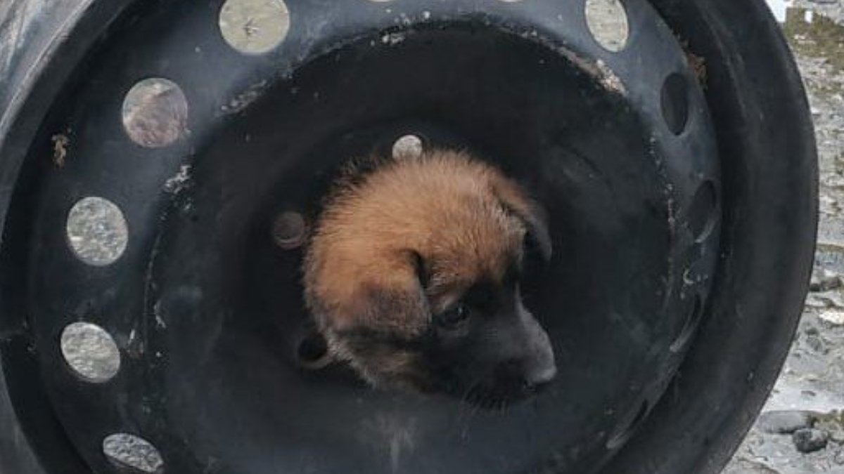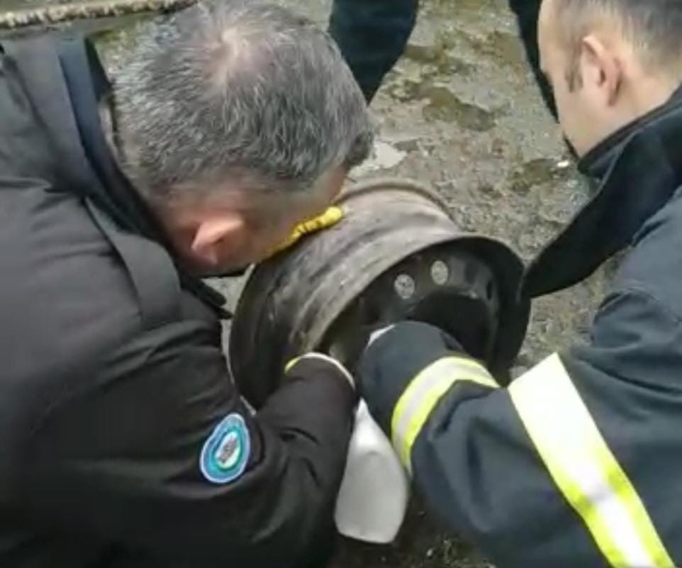 Perşembe ilçesine bağlı Efirli Mahallesi'nde, Gülderen Özsoy'a ait köpek yavrusunun başı, bahçede park halindeki otomobilin jantına sıkıştı.