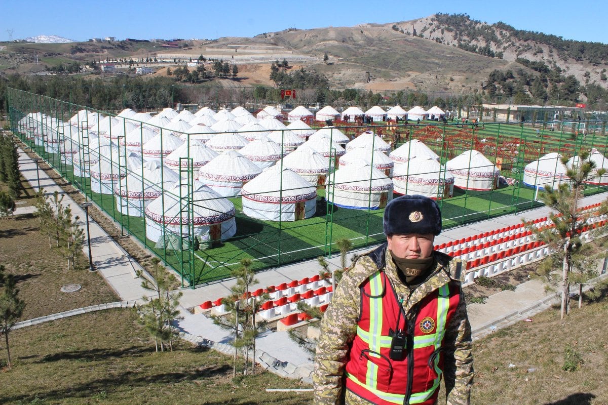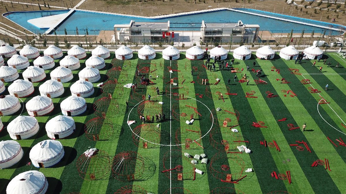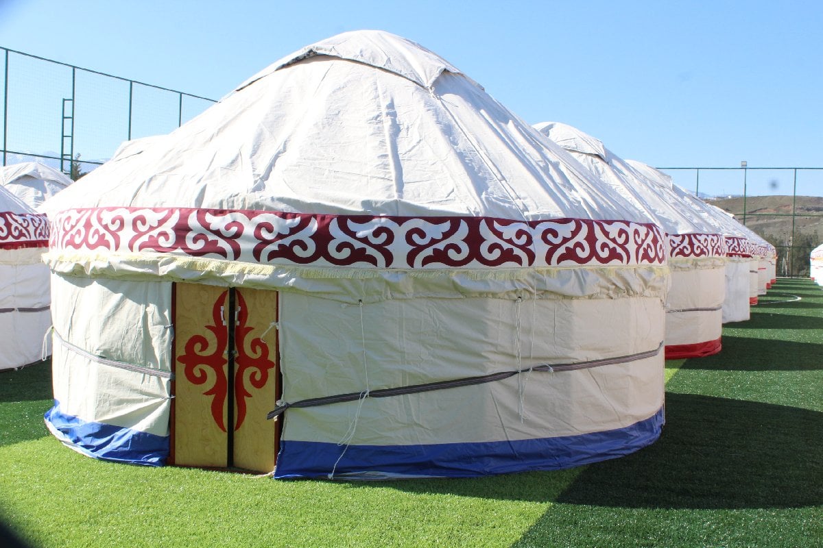 Kırgızistan Afet Bakanlığı, Kahramanmaraş'ta depremzedelerin barınması için geleneksel çadırları kurmaya başladı.