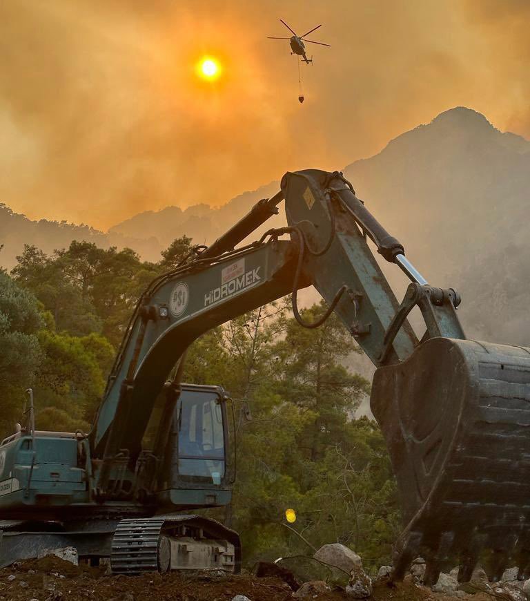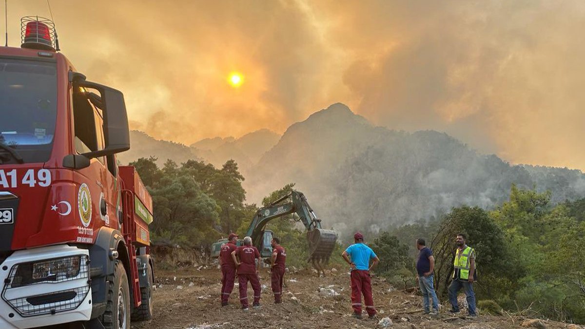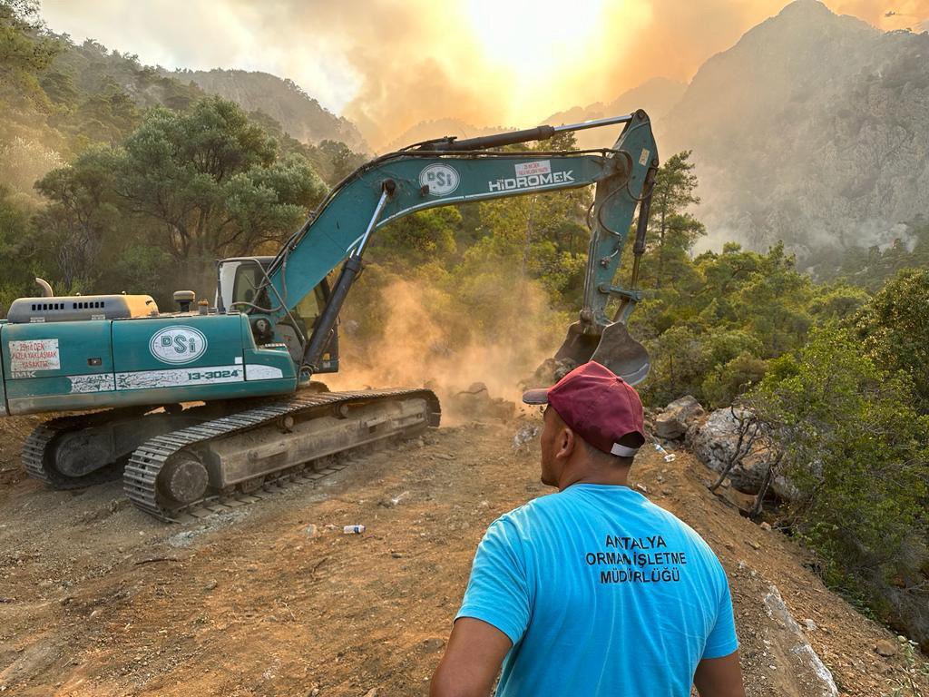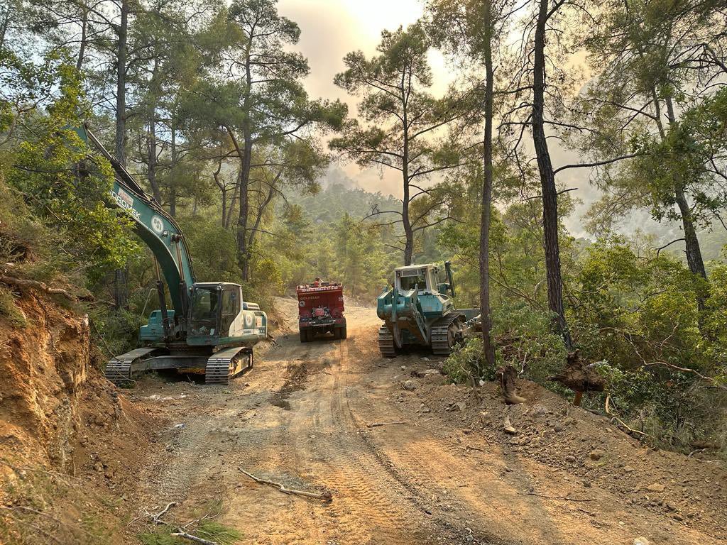 Kara ekipleri alevlerin yayıldığı yöne doğru yangının önünün kesmek ve arazözlerin ulaşımı için öncelikle yol açma çalışması gerçekleştiriyor. Alevlerin önünü kesmek için açılan yolların birleşmesiyle karadan söndürme çalışmaları hızlanıyor. (DHA)