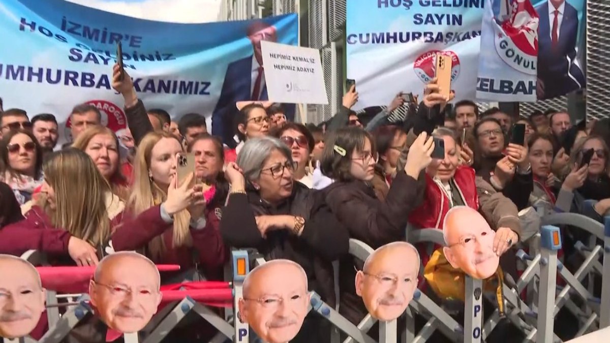 Havaalanı çıkışında Kılıçdaroğlu’nu coşkulu bir kalabalık bekledi. İç hatlar terminali çıkışında kalabalıktan tezahüratlar yükselmeye başladı. Üzerlerinde ‘İzmir’e hoş geldiniz Cumhurbaşkanımız’, ‘Hepimiz Kemal’iz hepimiz adayız’ yazılı pankartlar taşıyan kalabalık, ‘Halkın umudu Kılıçdaroğlu’, ‘Gençliğin umudu Kılıçdaroğlu’ sloganları attı.